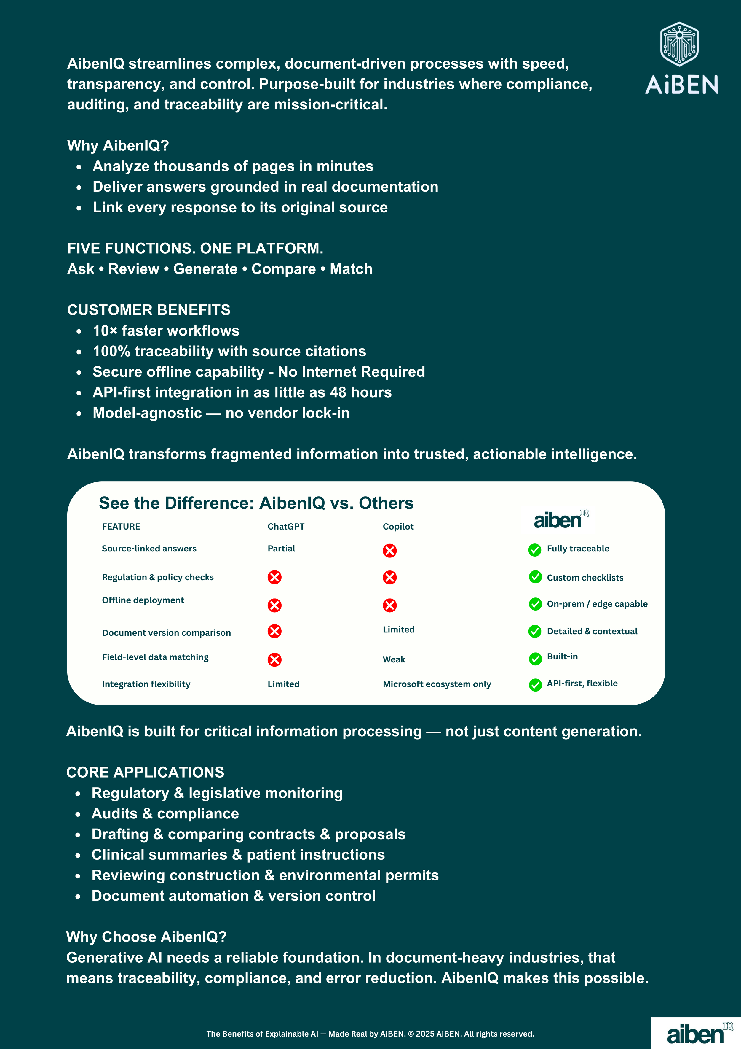 AibenIQ streamlines regulatory audits by analyzing complex compliance documents in minutes, not days—ensuring accuracy, consistency, and confidence in every review.