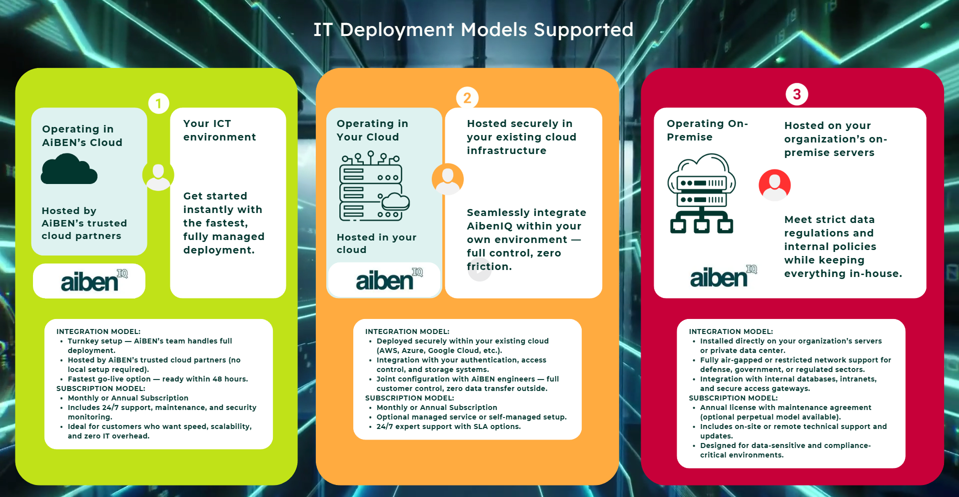 Host AibenIQ your way — with trusted cloud partners or fully on-premise.